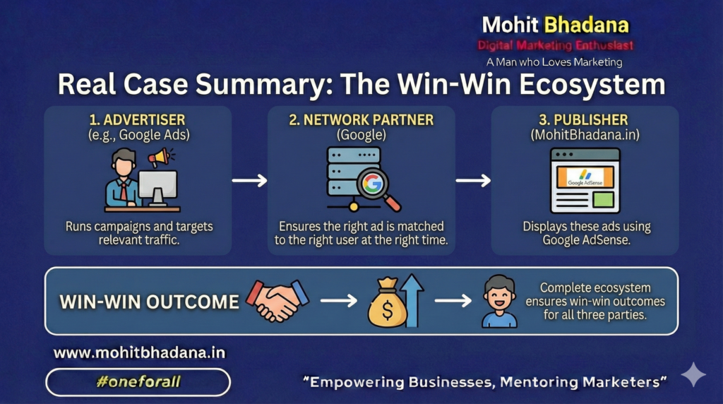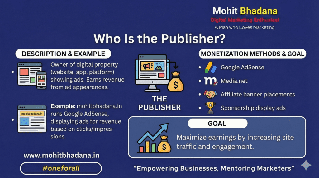 This article explains how online advertising platforms work by breaking down the roles of advertisers, publishers, and network partners. It covers how ads are created, matched, and delivered to users through ad networks, the step-by-step ad delivery process, and how platforms like Google AdSense monetize websites such as MohitBhadana.in. A practical guide for marketers, students, and business owners who want to understand the digital advertising ecosystem clearly.